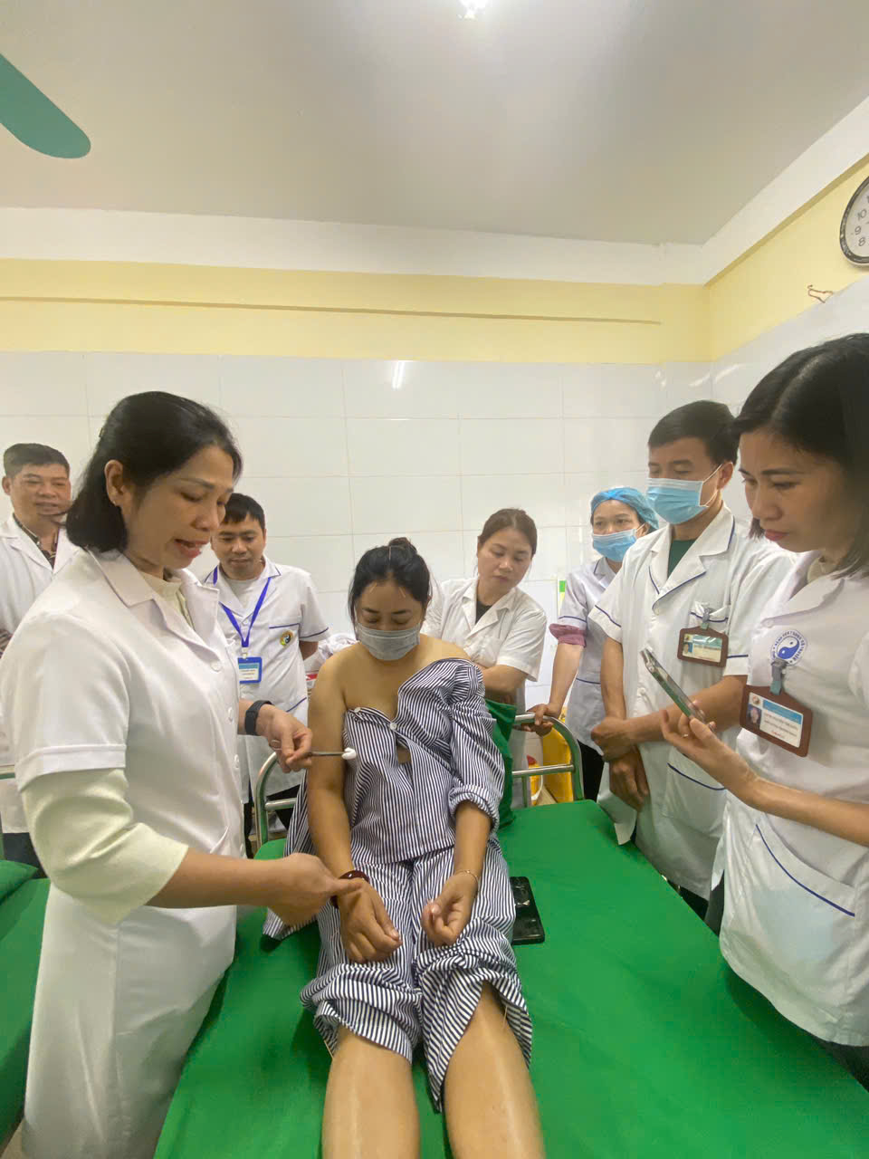 BSCKII Đào Diệu Thuý Phó Khoa Châm cứu dưỡng sinh Bệnh viện Y học cổ truyền Trung Ương đã đến các buồng bệnh hướng dẫn cho cán bộ y tế và trực tiếp làm các thủ thuật trên bệnh nhân. Vận dụng các phương pháp YHCT, chủ yếu là phương pháp không dùng thuốc như châm cứu, điện châm, nhĩ châm, xoa bóp bấm huyệt, khí công dưỡng sinh, Kéo giãn cột sống để điều trị có hiệu quả các bệnh lý về cơ xương khớp, rối loạn dẫn truyền thần kinh, di chứng tai biến mạch máu não, đau dây thần kinh…